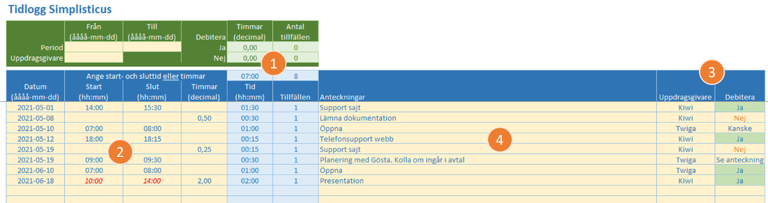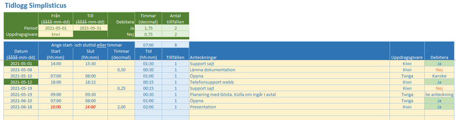 Det här kan till exempel vara användbart för att notera att jag varit tillgänglig i fyra timmar mellan 10:00 och 14:00, men bara debiterar två av dessa timmar. - I exemplet har jag två uppdragsgivare; Kiwi och Twiga. Jag har arbetat vid fem tillfällen för Kiwi och tänker debitera tre av dessa, och två tillfällen för Twiga varav ett eller möjligen två (se anteckningen) ska debiteras.