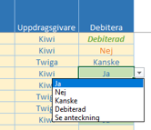 Värdet för debitering kan vara Ja/Nej/Kanske/Debiterad/Se anteckning. - Anteckningar är ett fritextfält.