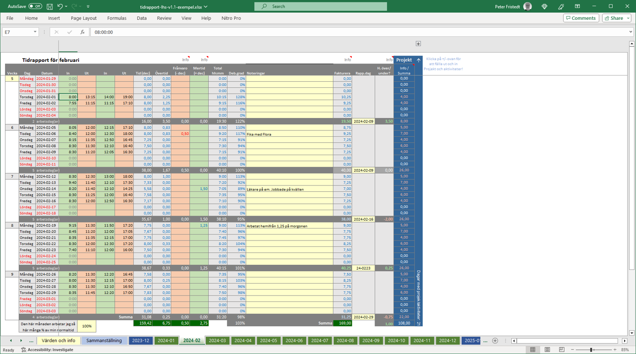 Jag är övertygad om att du kan köra igång och använda mallen direkt. Men om du behöver hjälp har jag beskrivit funktionerna mer i detalj på sidan Så här funkar det. Titta också gärna på exempelfilen. Den kan du ha för att testa och lära dig hur tidrapporten funkar.